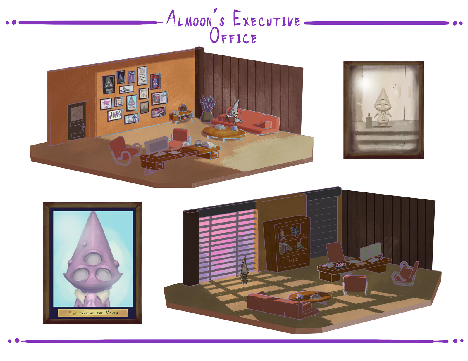 Almoon has a big office that further feeds his drive for self-improvement. He has many achievements and will make sure to tell you all about them. In Moonla's first chapter "Ticking Away" Almoon will bring Moonla into his office trying to motivate him to follow his path. We will see how that ends up.